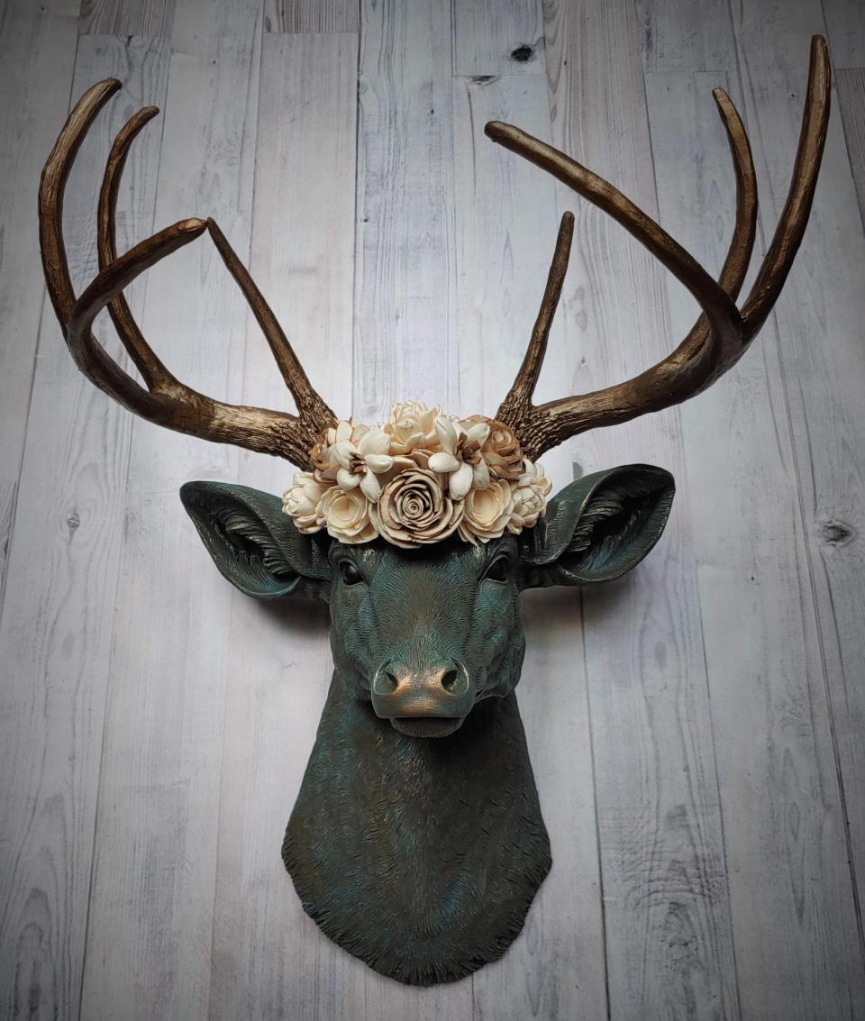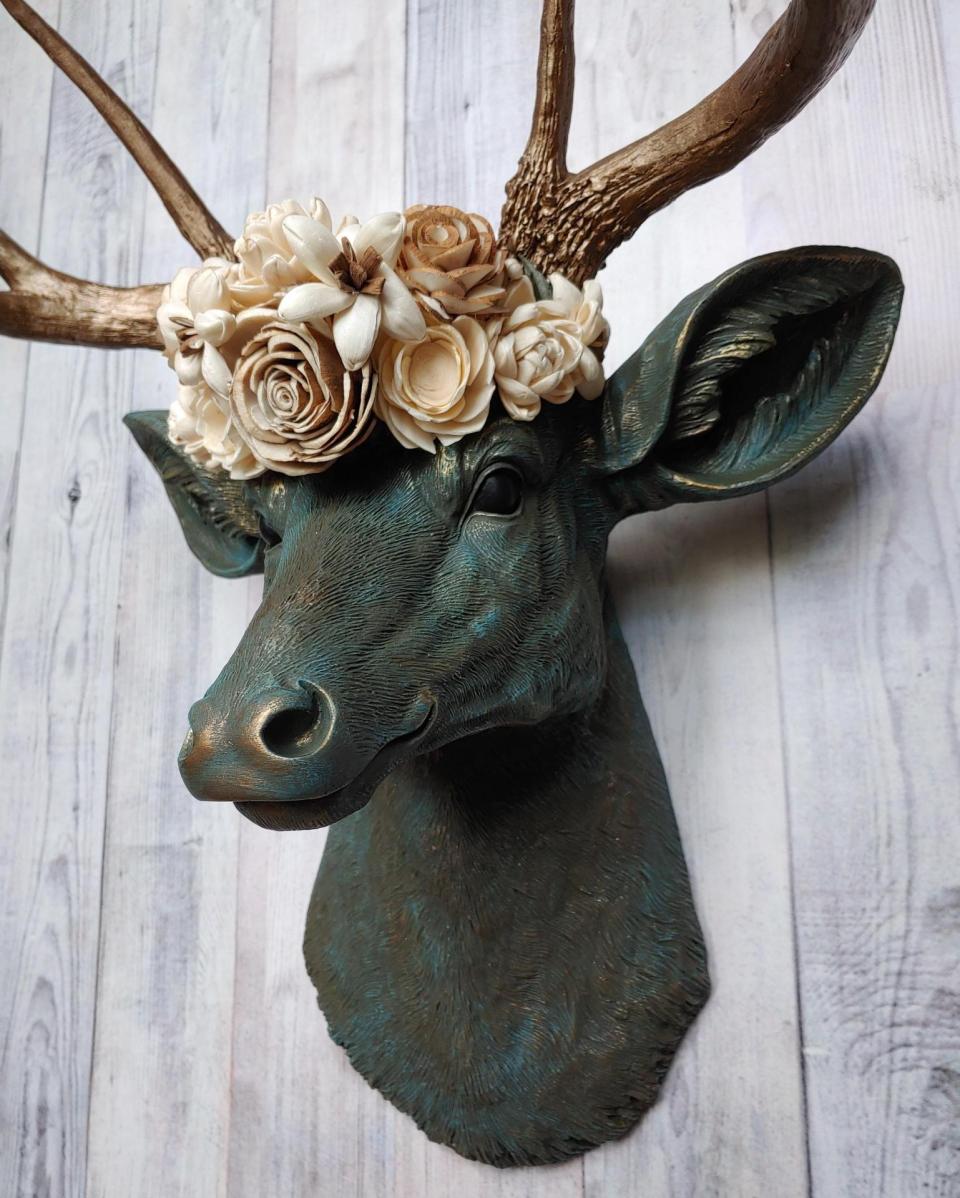 Beautiful floral crowned faux taxidermy deer head wall mount. This piece will be customized to your specifications. The item shown in the listing images was painted as follows: Deer Head Color: Verdigris , Antler Color: Antique Gold, Eye Color Choice: B. The deer head itself will be accented with whatever color you choose for the antlers in order to bring out the beautiful details in the cast. If you would prefer not to have the deer head accented with the antler color or accented with a different color please message me in the Notes to Seller box during checkout.