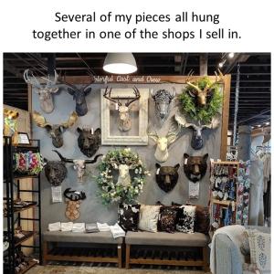 The deer head and antlers are made of cold cast resin. The entire piece measures 23" tall X 16" wide X 13" deep