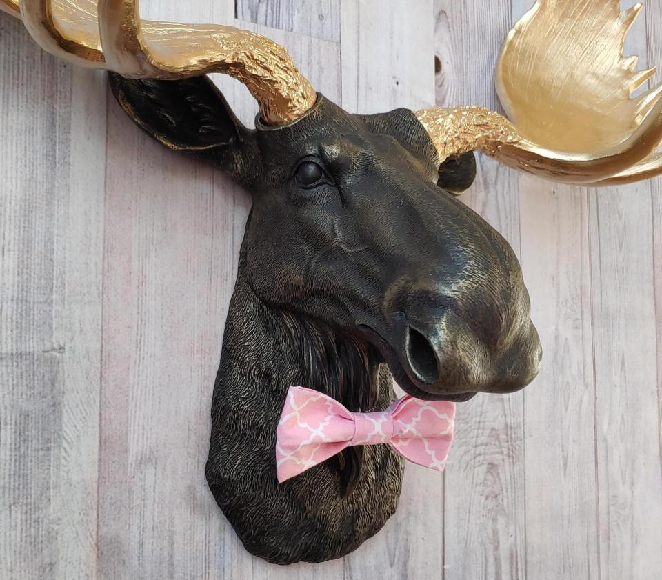 Unique faux taxidermy moose head, completed with a dapper bow tie! This piece will be customized to your specifications on color and bow tie fabric. The item shown in the listing images was painted as follows: Moose Head Color: Black, Antler Color: Gold, Eye Color Choice: B The moose head itself will be accented with whatever color you choose for the antlers in order to bring out the beautiful details in the cast. If you would prefer not to have the moose head accented with the antler color or accented with a different color please message me in the Notes to Seller box during checkout.