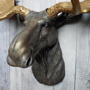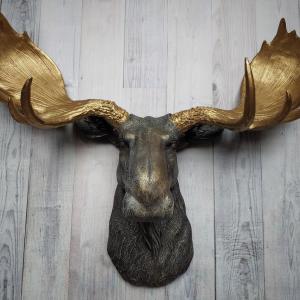 This particular moose head was done using chestnut brown as a base color. It's been accented with antique white and gold in order to bring out the beautiful details in the cast. The antlers were painted a regal gold. Your choice on eye color, the moose shown in the listing images has brown for the eyes.
